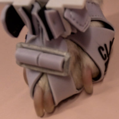 This frees up Clawgs' front edge to curve up in front of front pads (below claws), which reduces the risk of front toes sliding through Clawgs' front claws' opening.