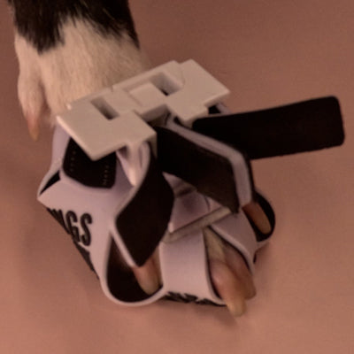 If your size 1-6 Clawgs' front edge extends beyond front (middle) pads while your dog is standing, feel free to cut a slit between the front pads and side claws without risking return rejection.