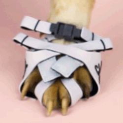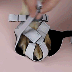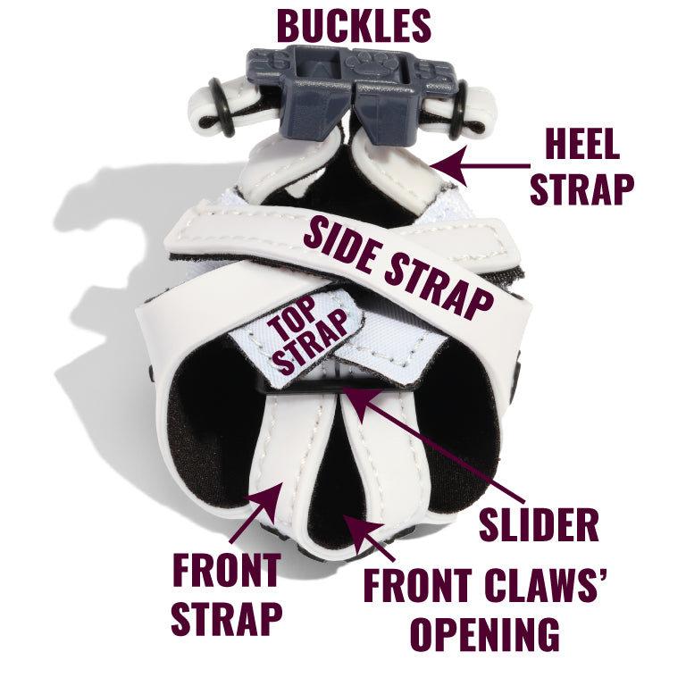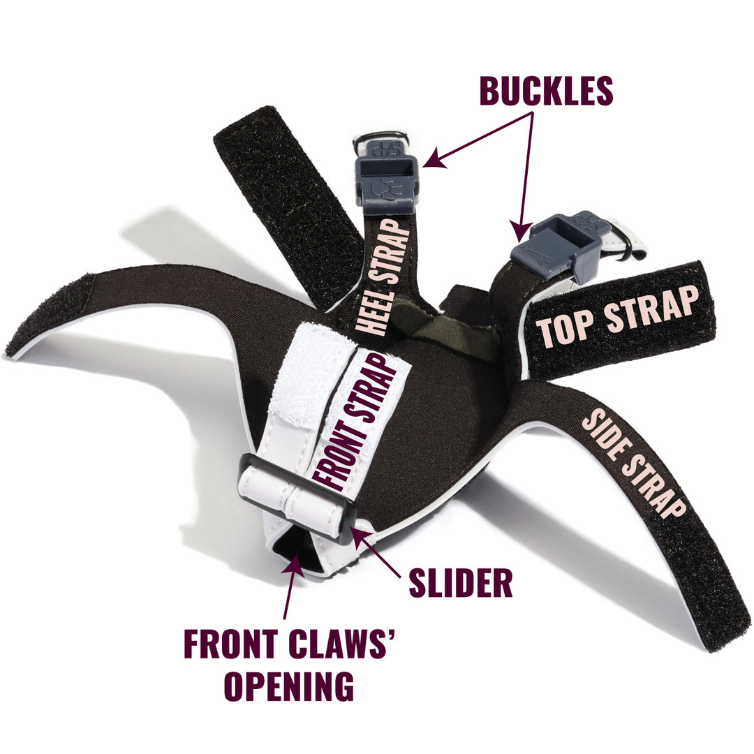 After fastening the buckle and fully tightening the heel straps around paws for the first time, immediately unfasten the buckle and remove the Clawgs from paws.