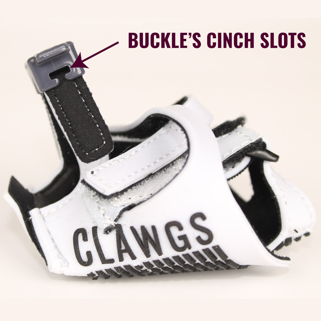 It is critical to secure heel straps in cinch slots. Failure to do so results in lots of problems, including Clawgs falling off or rotating off center.